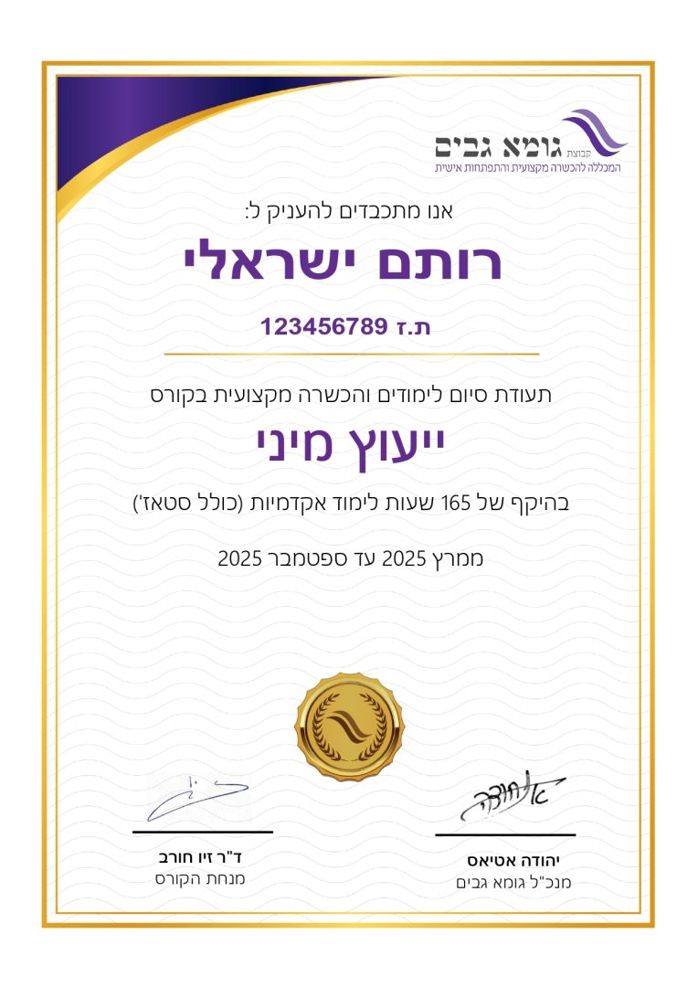 לאחר סיום ההכשרה בקורס ייעוץ מיני ועמידה בדרישות הסף יקבל המועמד תעודה מטעם גומא גבים המקנה לו את הסמכות לעסוק ביעוץ מיני וללוות יחידים וזוגות בקליניקה, בתחום המיניות.